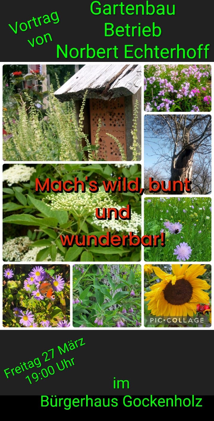 Der Bürgerverein Gockenholz, die Siedlergemeinschaft Lachtetal VWE Nds.e.V und Kreisgruppe Celle laden zu einem Vortrag, mit Norbert Echterhoff Gartenbau Betrieb, ins Bürgerhaus Gockenholz Wehenberg 1, zu einem Vortrag ein. Mit der wunderbar bunten Pflanzenwelt die bedrohte Vielfalt der Natur fördern! Denn alles hängt mit allem zusammen.